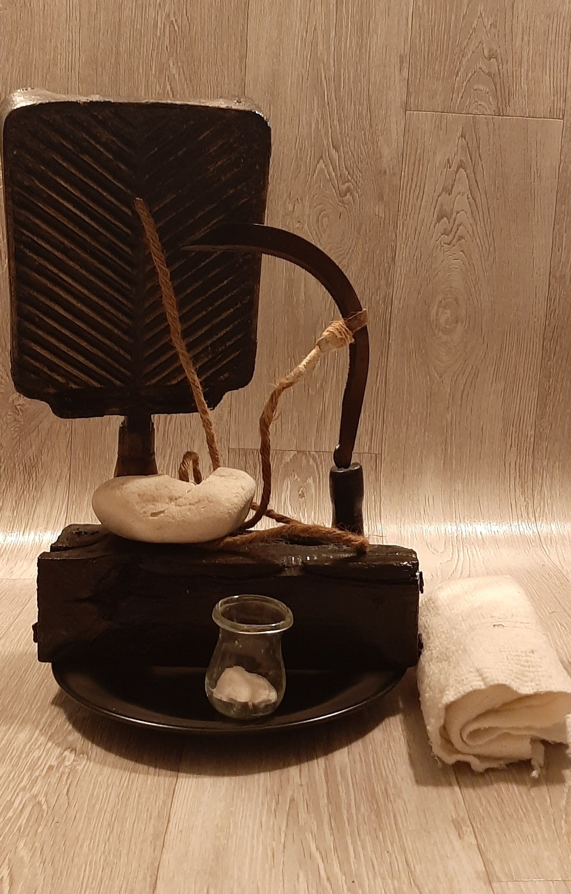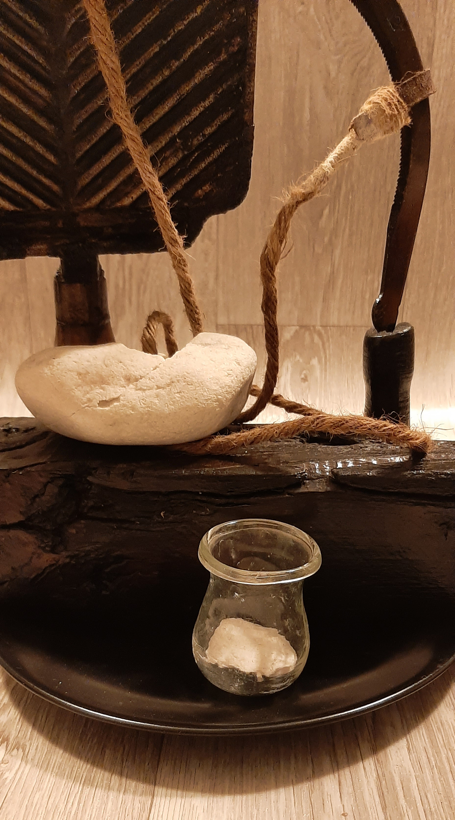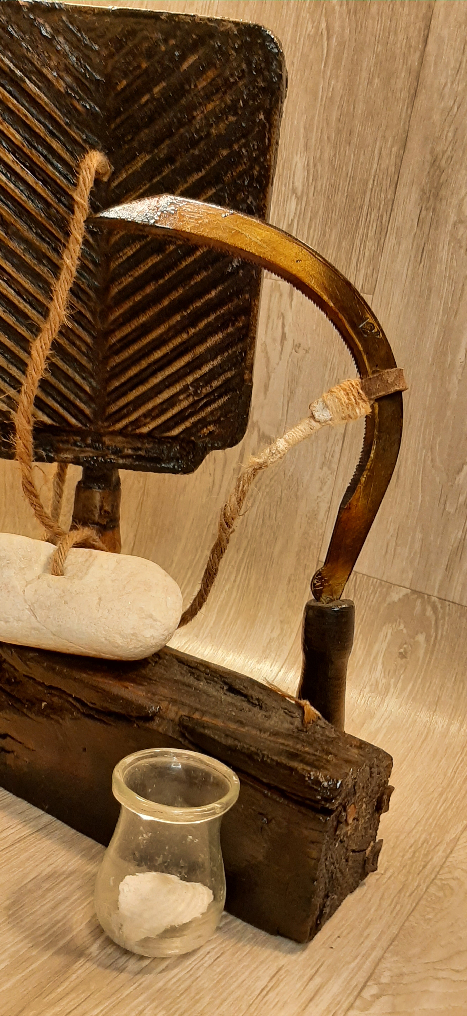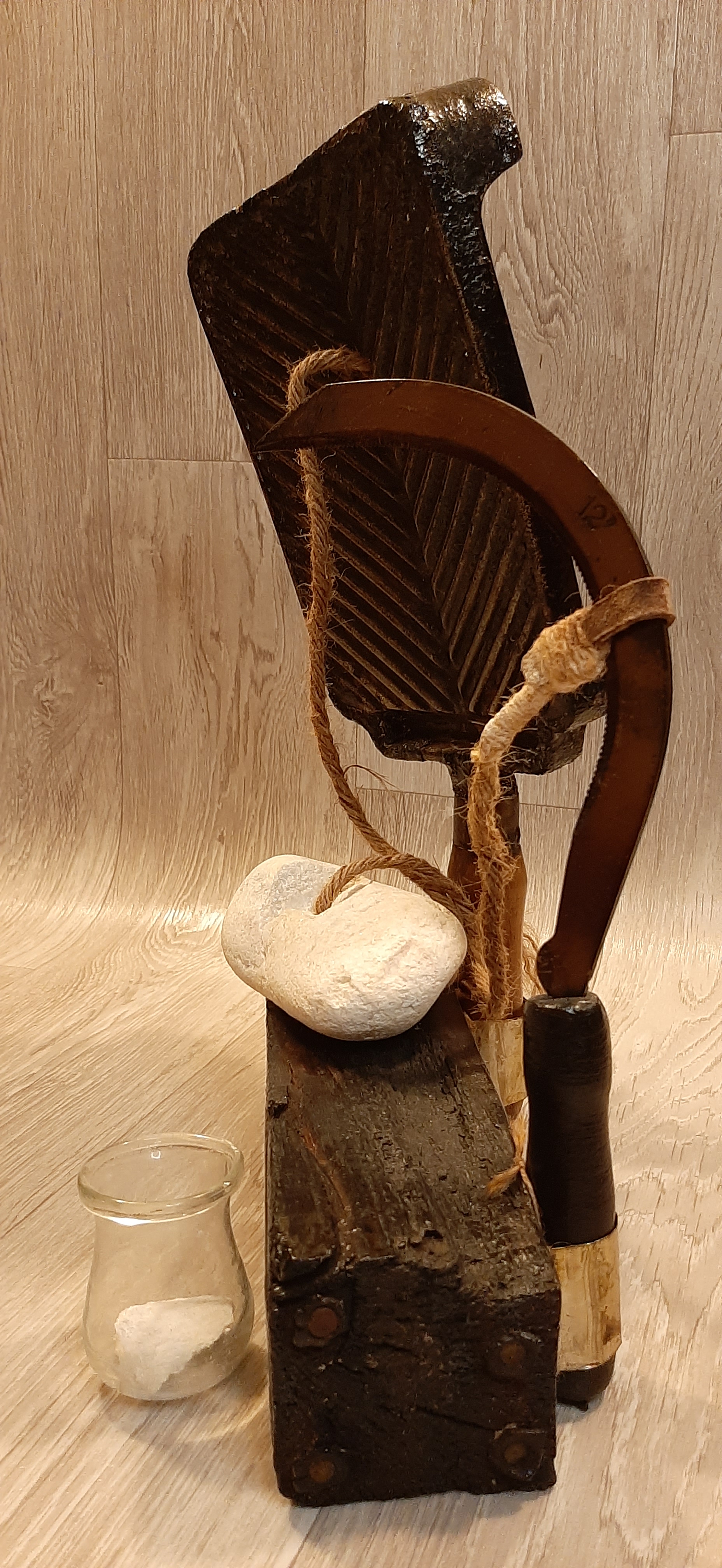 Obiecte: Grătar metalic, Secere, Lemn (stejar), „Ventuză” de sticlă, Sfoară de Cânepă, Piatră de Râu